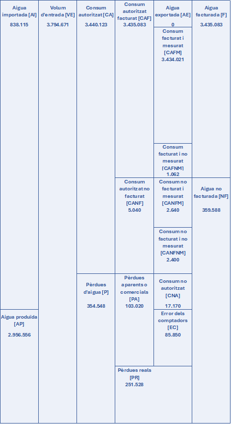 Aquest valor es calcula segons la metodologia indicada a l'Annex X - Avaluació de fuites estructurals, del RD 3/2023, del 10 de gener, pel qual s’estableixen els criteris tècnic-sanitaris de qualitat de l’aigua de consum, el seu control i subministrament.